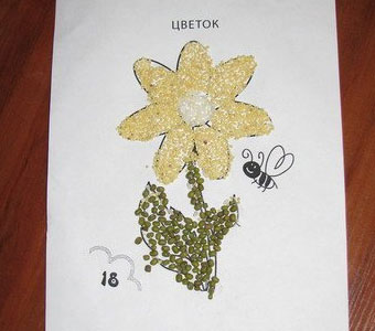 Лепестки цветка делаем из пшена, тоже предварительно смазав их клеем ПВА.
